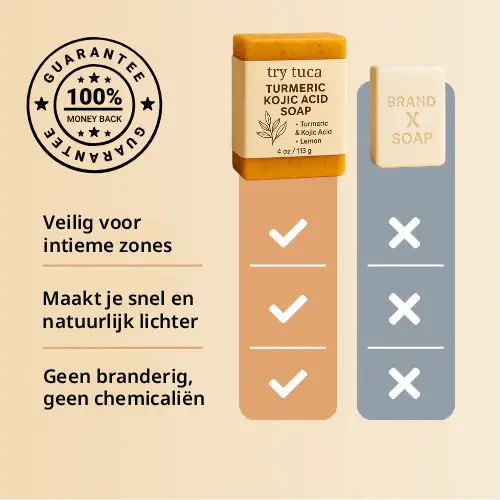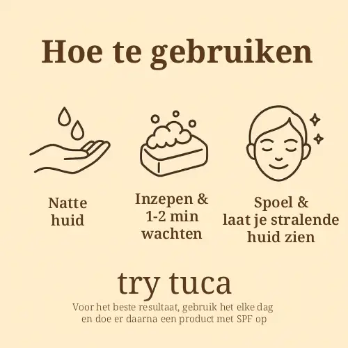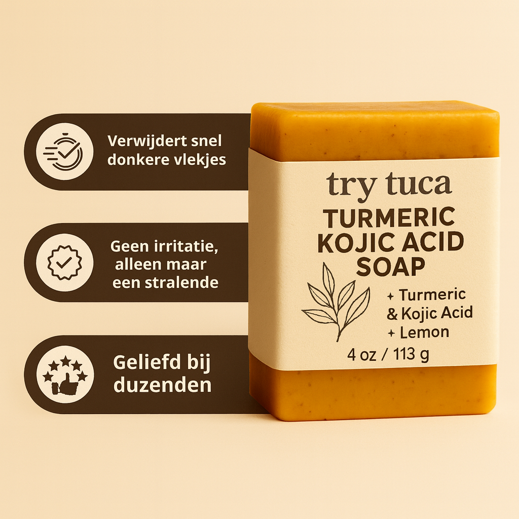 Elke bestelling bevat één TryTuca™ zeepbar (±120 g) met kurkuma, kojiczuur en citroen. Dit is doorgaans voldoende voor meerdere weken gebruik, afhankelijk van de zones en frequentie.